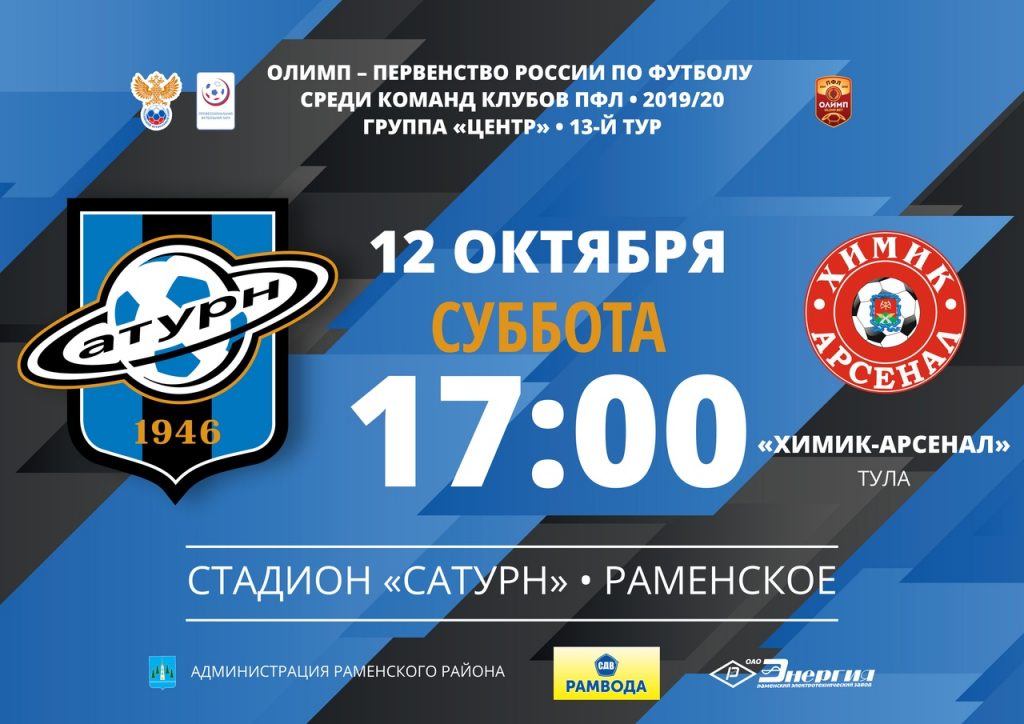 12 октября на стадионе «Сатурн» г.Раменское состоится футбольный мачт между командами «Сатурн» «Химик-Арсенал». Начало в 17.00 часов.