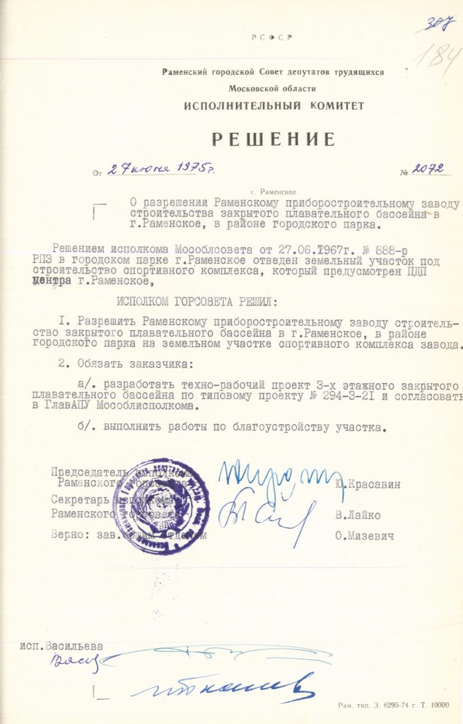 На заседании исполнительного комитета Раменского городского Совета депутатов трудящихся Московской области 27 июня 1975 года было принято решение о разрешении Раменскому приборостроительному заводу строительства закрытого плавательного бассейна в районе городского парка города Раменское.