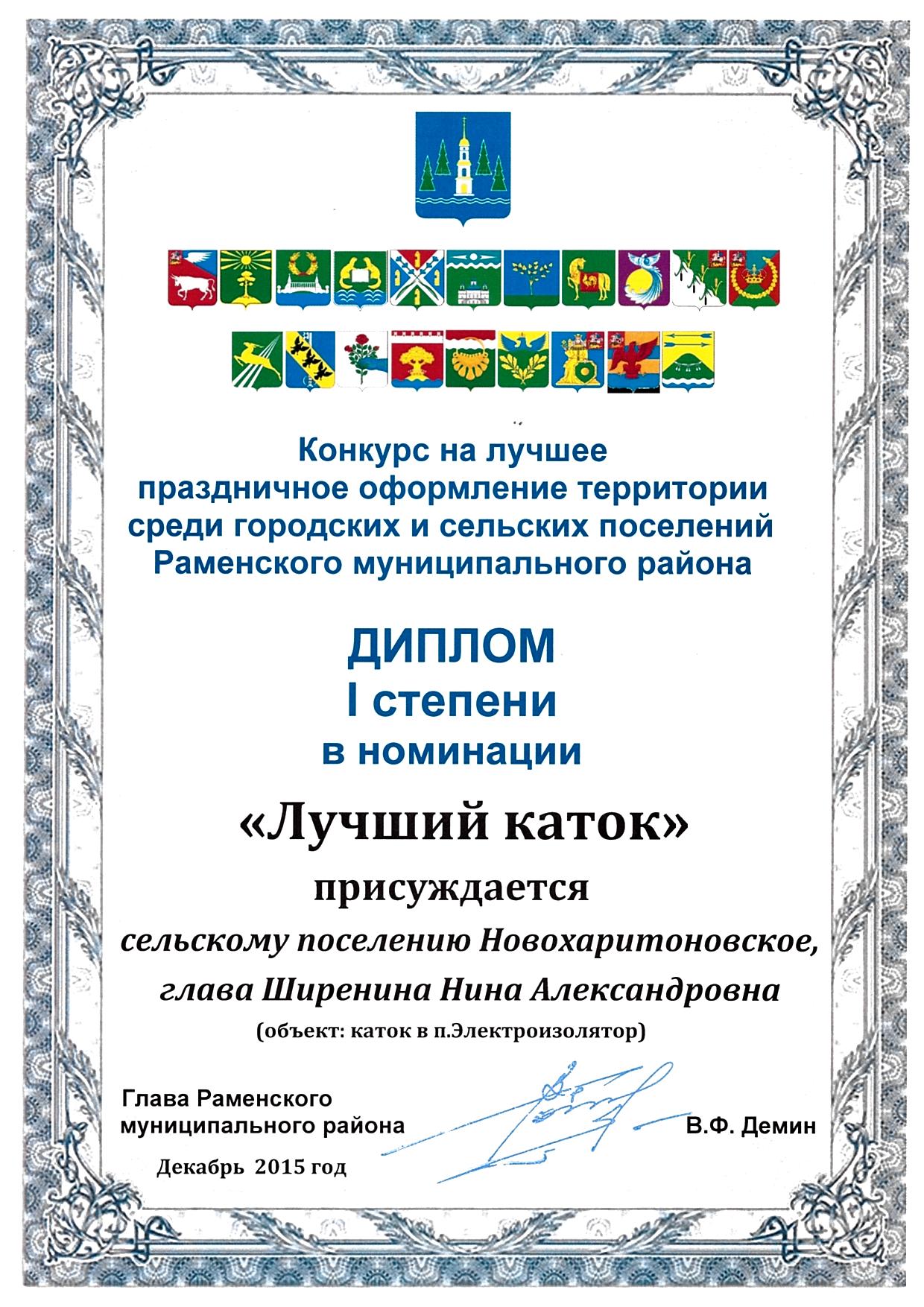 — Дипломом I степени за победу в номинации «Лучшее праздничное оформление административного центра поселения» (объект: пос.Электроизолятор);
