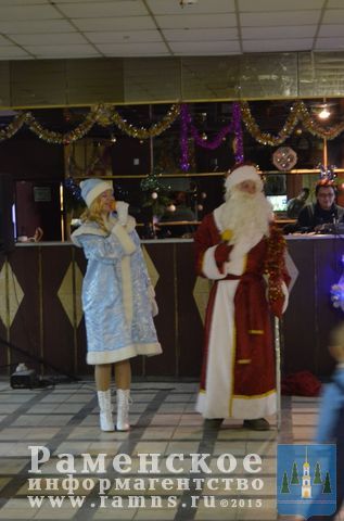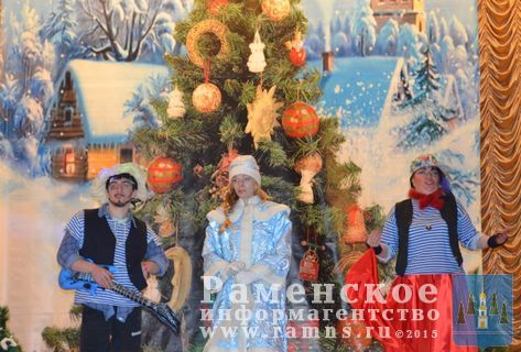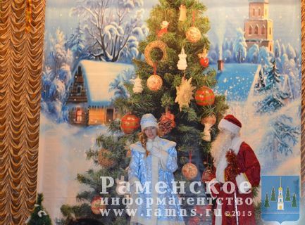 Детей перед началом представления развлекали Дед мороз и Снегурочка: водили хоровод, рассказывали стихотворения, танцевали и играли.