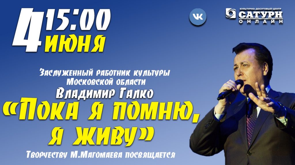 «Пока я помню, я живу» – так называется концерт заслуженного работника культуры Московской области ВЛАДИМИРА ГАЛКО. Он посвящается творчеству легендарного артиста Муслима Магомаева.