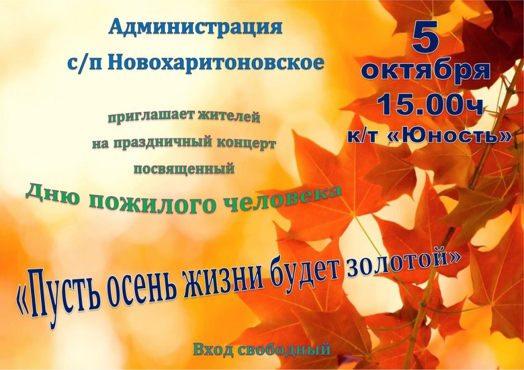 5 октября в кинотеатре «Юность» с/п Новохаритоновское пройдет праздничный концерт, посвященный Дню пожилого человека. Начало в 15.00. Вход свободный.