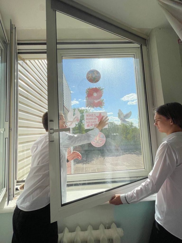 На окнах размещают портреты родственников-героев войны, надписи «9 Мая», «С Днем Победы!», рисунки красками и цветными карандашами на патриотическую тематику. Также оформляют окна изображениями российского и советского флагов, красных звезд, голубей мира, воздушных шаров, залпов салюта, георгиевской ленты и в этом году цифры 80 – количества лет, прошедших с момента Победы.