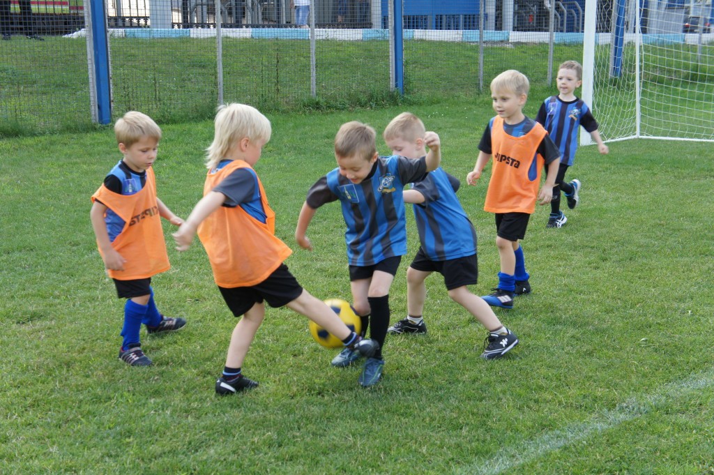 Сначала тренеры провели с ребятами из детской футбольной команды «Сатуренок» разминку, чтобы не было травм. Проработали все мышцы от головы до ног. Затем юных футболистов разделили на две группы: ребята постарше должны были пробежать через лесенку, высоко поднимая бедро, а после схватить мяч, который находился на противоположном конце поля, малыши играли в «футбольные» салочки, так как догонять нужно было с мячом в руках.