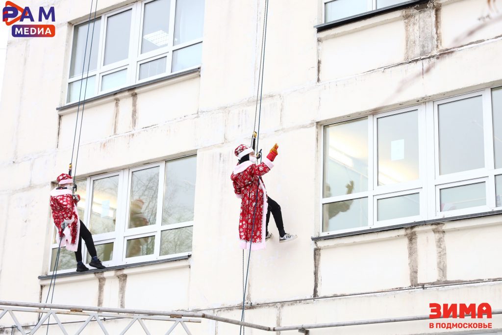 Сотрудники отряда «Центроспас» МЧС России, Раменской пожарной части №42 и Госпожнадзора в костюмах Дедов Морозов спустились на веревках с крыши хирургического корпуса, где находятся палаты с маленькими пациентами.