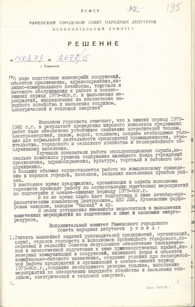 В решении исполнительного комитета Раменского городского Совета народных депутатов от 14 августа 1979 года № 2678/15 идет речь о подготовке предприятий, объектов здравоохранения, жилищно-коммунального хозяйства, торговли и других к работе в осенне-зимний период. Городская власть отмечает, что в результате проведенного комплекса мероприятий было обеспечено устойчивое снабжение потребителей теплом, газом, водой, электроэнергией. Но для того, чтобы поддерживать качественный уровень снабжения, исполком ставит перед предприятиями и организациями задачи по установлению контроля за ходом выполнения графиков подготовки учреждений и служб к зиме, по обеспечению высокого качества предзимних работ, по проведению испытаний тепловых сетей, по созданию запасов резервного топлива и другие.