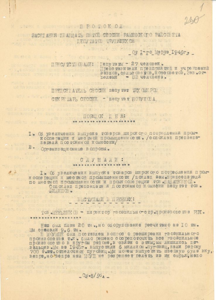 Ознакомившись с текстом Протокола заседания 25-й сессии Раменского райсовета депутатов трудящихся от 1 марта 1946 года, можно понять, в чём остро нуждались жители нашего района – это стройматериалы (кирпич, гвозди), обозный инвентарь (телеги, сани), сельхозинвентарь (грабли, лопаты), товары быта (посуда, ложки, вилки, ножи, вёдра), одежда и обувь (особенно детская) и, конечно, продукты питания.