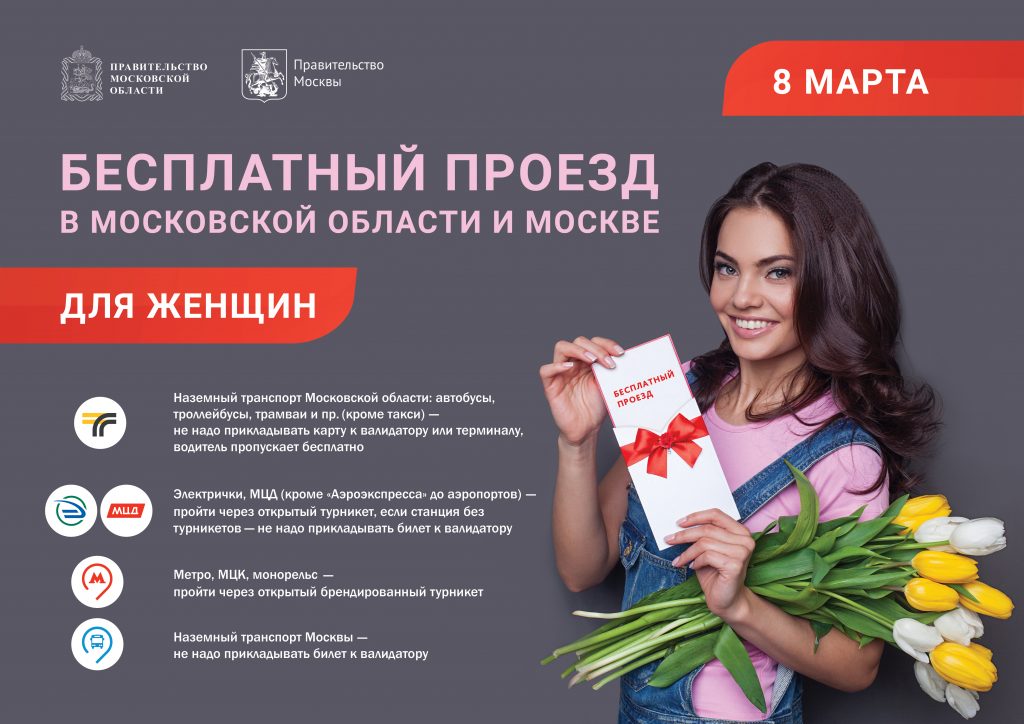 Губернатор Московской области Андрей Воробьев совместно с Мэром Москвы Сергеем Собяниным принял решение о том, что 8 марта, в Международный женский день, проезд во всех видах общественного транспорта Подмосковья и столицы для женщин будет бесплатным. В акции участвуют все перевозчики Московского региона.