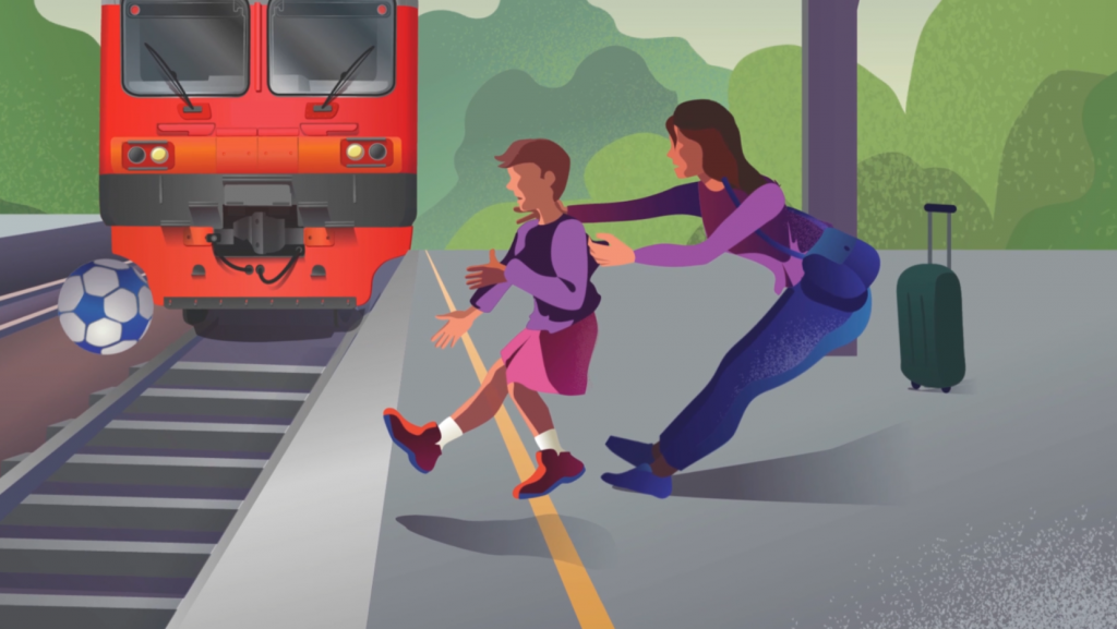 - Избегайте близости к путям и вагонам: категорически запрещено ходить по путям, подлезать под вагоны или перелезать через них. Неподвижные на первый взгляд вагоны могут начать движение в любой момент. Нельзя находиться ближе 5 метров от крайнего рельса.