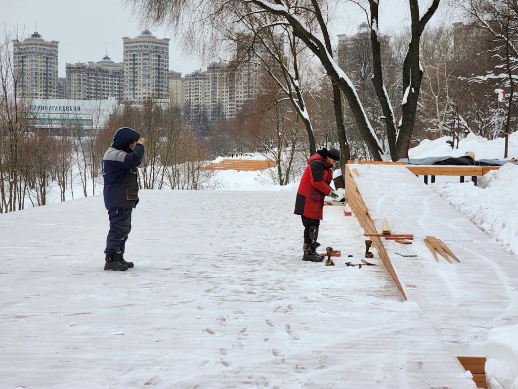🪛 Подрядчики уже выполнили 90 % монтажа палубной доски на смотровых площадках и настилах. Сейчас завершают обшивку торцов и переходят к земляным работам — роют траншею для прокладки системы наружного освещения и видеонаблюдения.