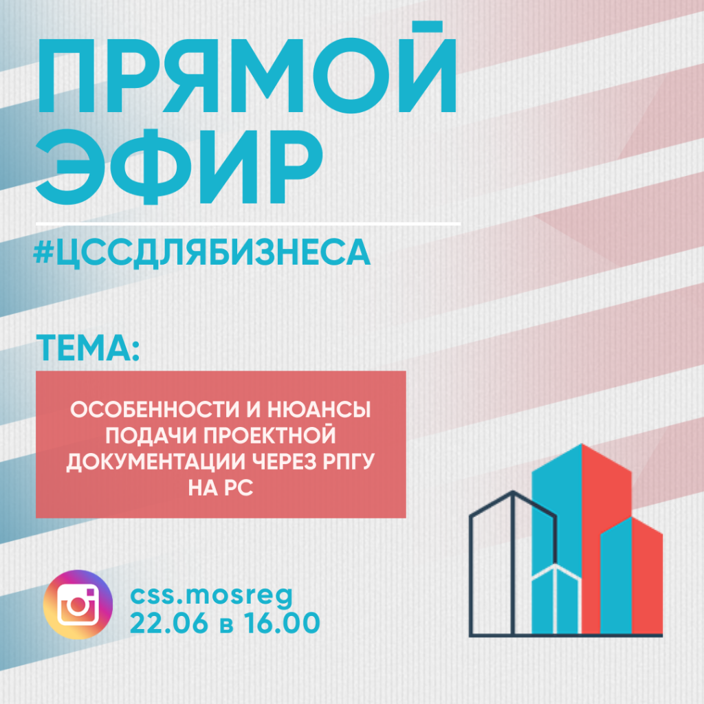 22 июня в 16:00 во вторник в инстаграме Центра содействия строительству при Правительстве Московской области @css.mosreg состоится прямой эфир на тему «Особенности и нюансы подачи проектной документации через РПГУ на РС».