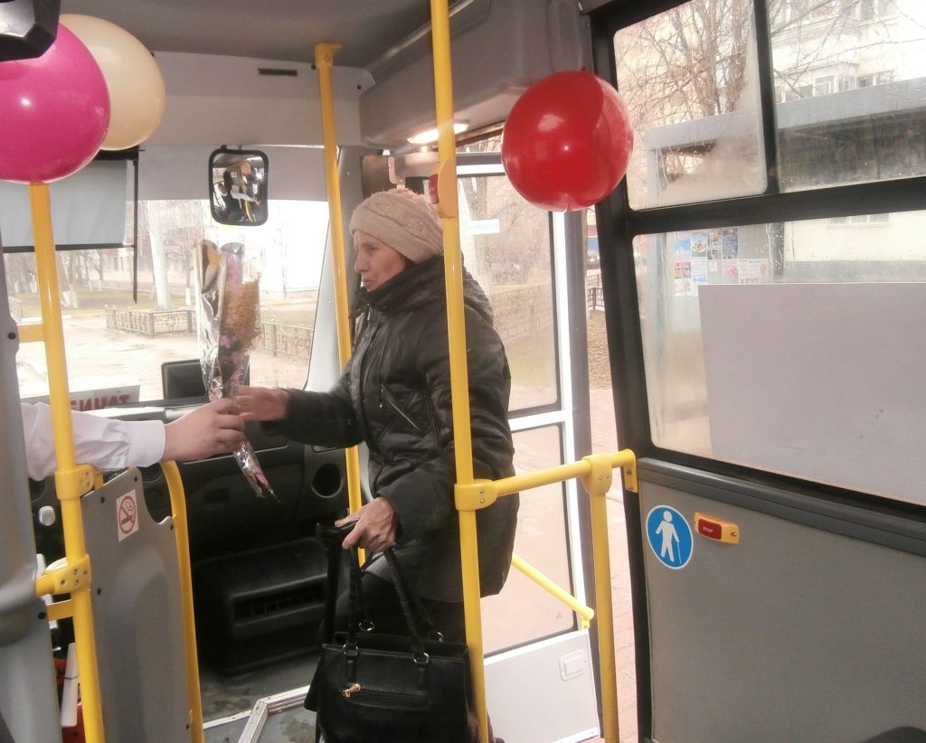 — Очень приятный и неожиданный сюрприз, — говорит одна из пассажирок праздничного автобуса Елена. – Я слышала, что сегодня для женщин будет бесплатный проезд, но не слишком в это верила. А тут не только бесплатно довезли, но еще и цветы подарили. Это очень поднимает настроение. Особенно в такую ненастную погоду, как сегодня. Спасибо всем!
