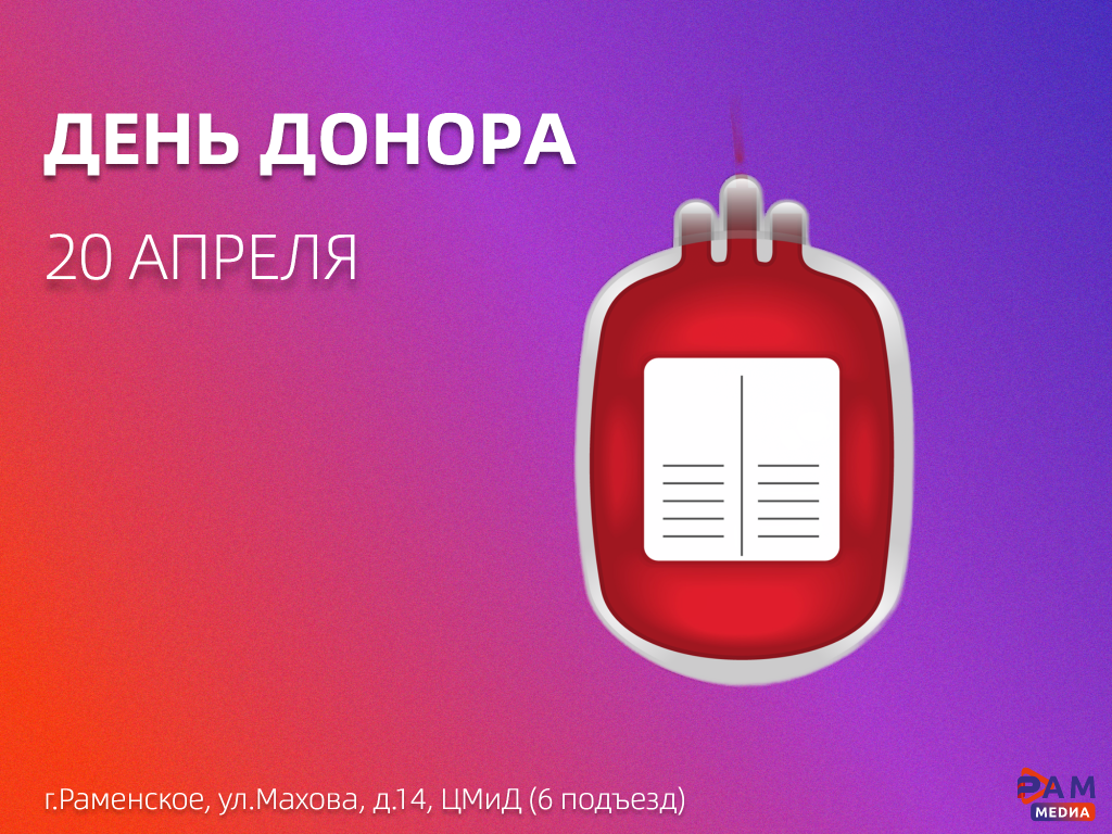 Доноров ждут с 8:00 до 12:00 по адресу: г. Раменское, ул. Махова, д. 14, ЦМиД, 6 подъезд.