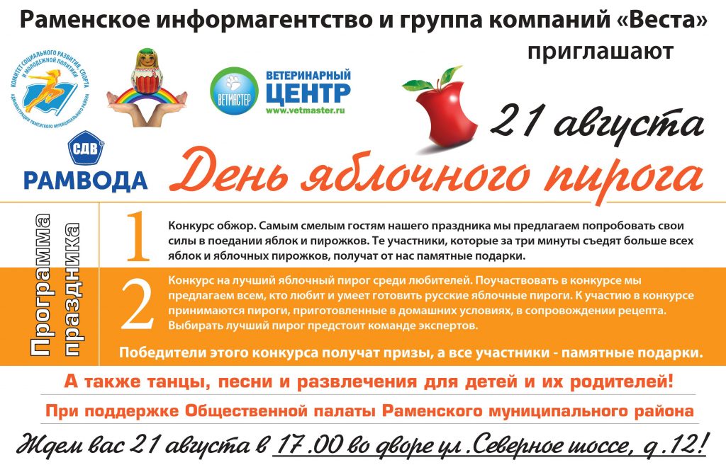 Раменское информагентство и группа компаний «Веста» сегодня в 17-00 проведут праздник под названием «День яблочного пирога». Мероприятие пройдет по адресу г.Раменское, ул. Северное шоссе, д.12.