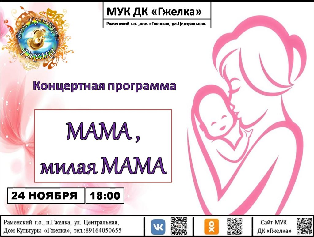 Так, 24 ноября в ДК «Гжелка» проведут концертную программу «Мама, милая мама». Начало в 18-00.