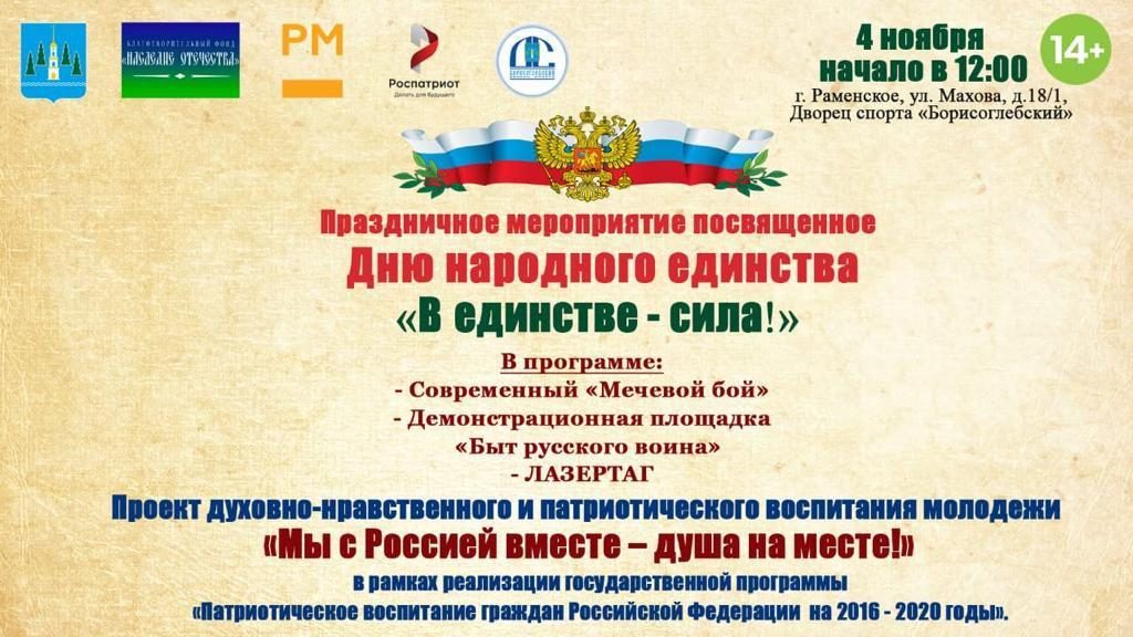 4 ноября в Раменском во дворце спорта «Борисоглебский» пройдет праздничное мероприятие под названием «В единстве сила», посвященное Дню народного единства. В рамках проекта духовно-нравственного и патриотического воспитания молодежи «Мы с Россией вместе – душа на месте!» (государственная программа «Патриотическое воспитание граждан Российской Федерации на 2016-2020 годы») для гостей мероприятия подготовили выступления современного «Мечевого боя», демонстрационную площадку «Быт русского воина», показательные игры в Лазертаг.