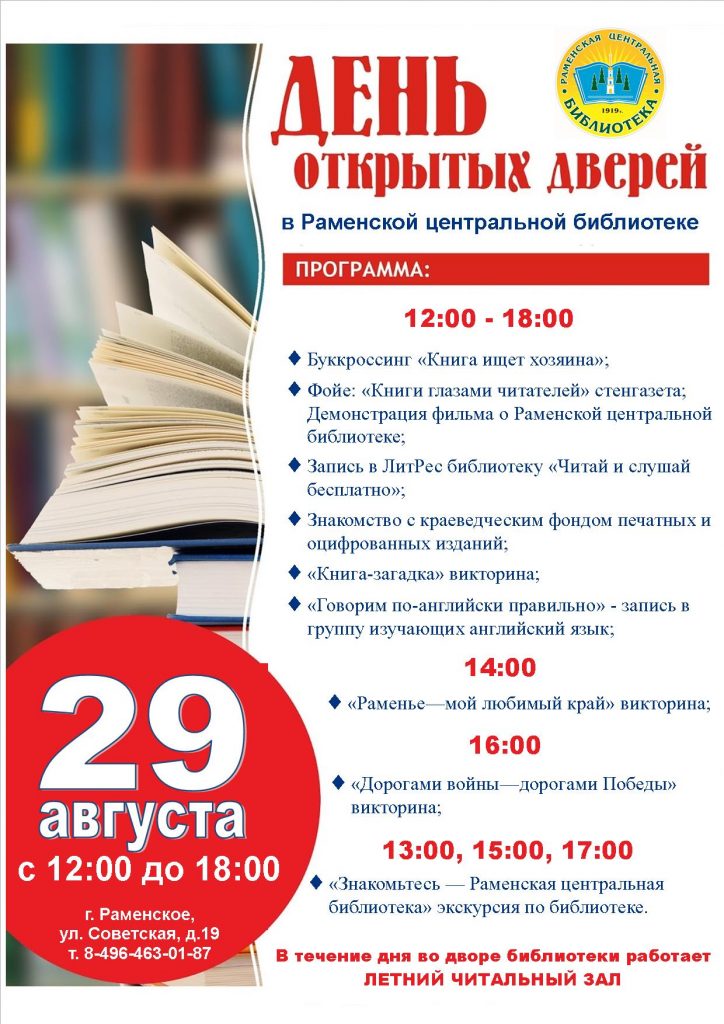 В последнюю субботу лета, 29 августа, все библиотеки Подмосковья проведут единый День открытых дверей. Раменская центральная библиотека подготовила программу, которая продемонстрирует возможности библиотеки как места для встреч, работы, учёбы, творчества.