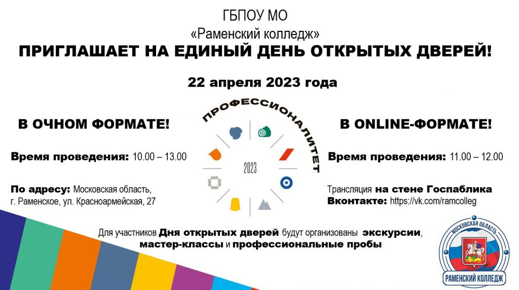 22 апреля в Раменском колледже на базе образовательно- производственного центра (кластера) по отрасли «Радиоэлектроника» состоится Единый День открытых дверей в рамках Федерального проекта «Профессионалитет».