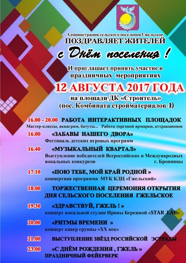 12 августа в сельском поселении Гжельское на площади дома культуры «Строитель» в поселке Комбината Стройматериалов-1 пройдут праздничные мероприятия, посвященные празднованию Дня сельского поселения Гжельское.
