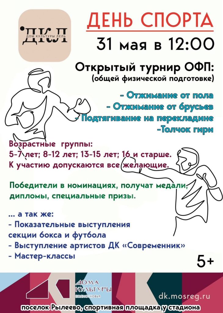 31 мая 2025 года в 12:00 на спортивной площадке у стадиона в поселке Рылеево состоится День спорта, в рамках которого пройдет открытый турнир по общей физической подготовке (ОФП).