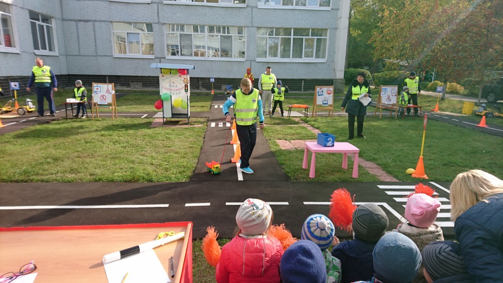 И вновь на территории детского сада, на обновленной транспортной площадке , 4 октября 2017 года под руководством заместителя заведующего по безопасности Татьяны Ивановой и Госинспектора по пропаганде Татьяны Коренковой состоялось спортивно-развлекательное мероприятие «Папа, мама, я- знающая ПДД спортивная семья», проведенная с участием семейных команд: семьи Левиных-команда «Светофорчик», семьи Анниных-команда «Право руля», семьи Кочетовских-команда «Веселые ребята», которые решили отправиться в автомобильное путешествие, но были остановлены сотрудниками ДПС из-за необходимости сначала продемонстрировать знания правил дорожного движения, так как умелое применение их в путешествии поможет избежать сложных ситуаций на дороге, сохранить свое здоровье.