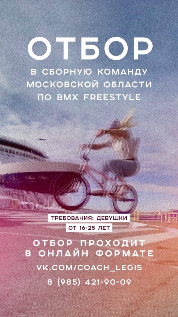 Если вы девушка в возрасте от 16 до 25 лет (2009-2000 г.р.) и умеете кататься на BMX, занимаетесь BMX-race или трюковым самокатом, то у вас есть возможность присоединиться к команде Московской области по BMX freestyle!