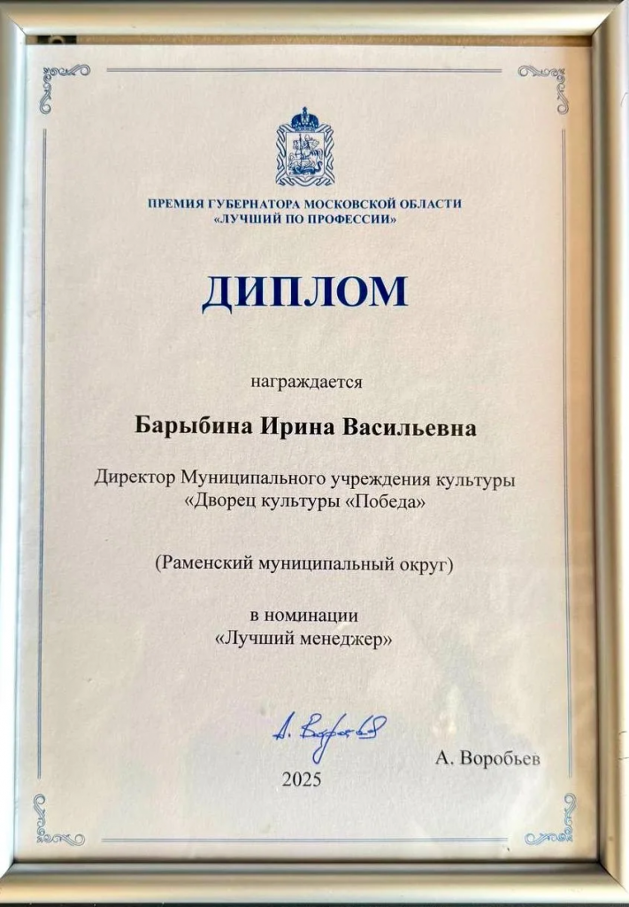 Распоряжением Губернатора Московской области № 82-РГ от 27.02.2026 г. объявлены победители конкурса на соискание премии Губернатора Московской области «Лучший по профессии» работникам учреждений в сфере культуры и организациям дополнительного образования сферы культуры Московской области в 2026 году. Только 10 человек из всего Подмосковья, лучших представителей в своей профессии, работающих в сфере культуры, были выбраны конкурсной комиссией и представлены к награде. Честь Раменского округа в этом конкурсе отстояла директор Дворца культуры «Победа».
