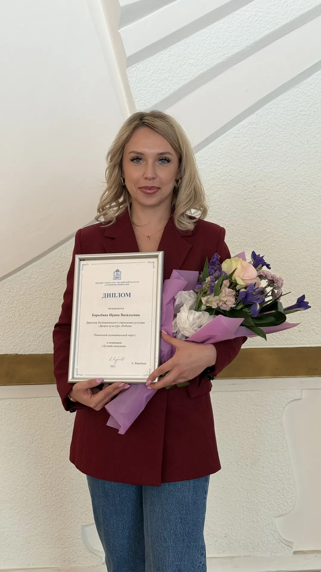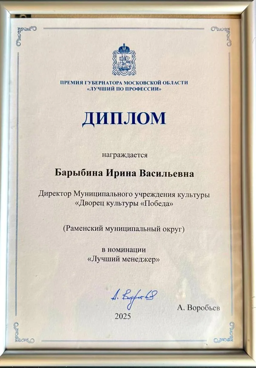 Распоряжением Губернатора Московской области № 82-РГ от 27.02.2026 г. объявлены победители конкурса на соискание премии Губернатора Московской области «Лучший по профессии» работникам учреждений в сфере культуры и организациям дополнительного образования сферы культуры Московской области в 2026 году. Только 10 человек из всего Подмосковья, лучших представителей в своей профессии, работающих в сфере культуры, были выбраны конкурсной комиссией и представлены к награде. Честь Раменского округа в этом конкурсе отстояла директор Дворца культуры «Победа».