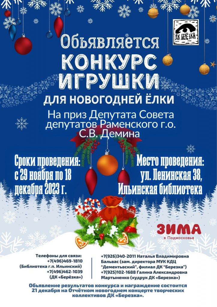 По итогам конкурса состоится торжественное награждение победителей и участников на отчетном новогоднем театрализованном концерте творческих коллективов Дома культуры «Березка». Лучшие елочные игрушки украсят главную новогоднюю ель поселка!
