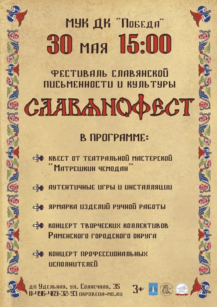 ДК «Победа» (п.Удельная Раменского г.о.) проведет фестиваль славянской письменности и культуры 30 мая. Начало — в 15:00.