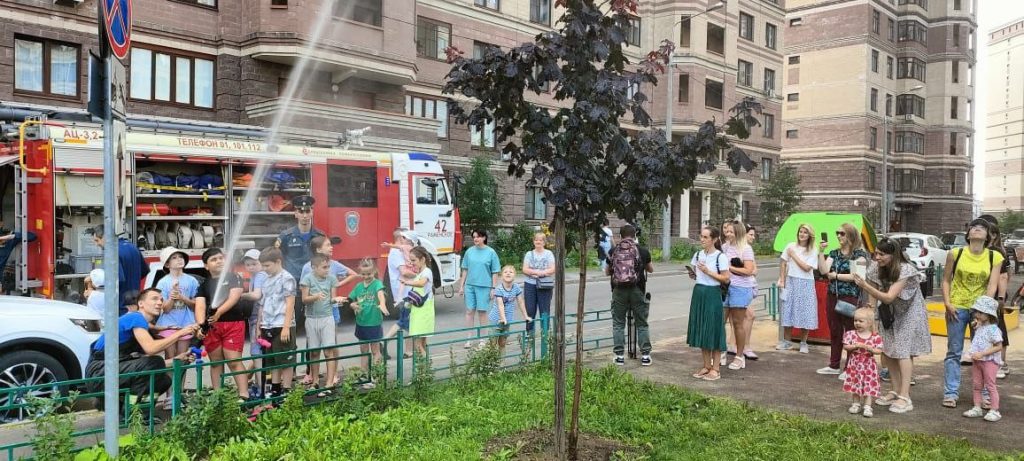 Дети и взрослые были рады увидеть специальную технику и изучить ее. Ребята смогли включить сирены и воспользоваться громкоговорителем. Пожарные рассказали детям об оснащении пожарно-спасательной машины и своей профессии. Возможность самостоятельно потушить «пожар» с помощью подачи воды из автоцистерны привела детей и родителей в восторг.