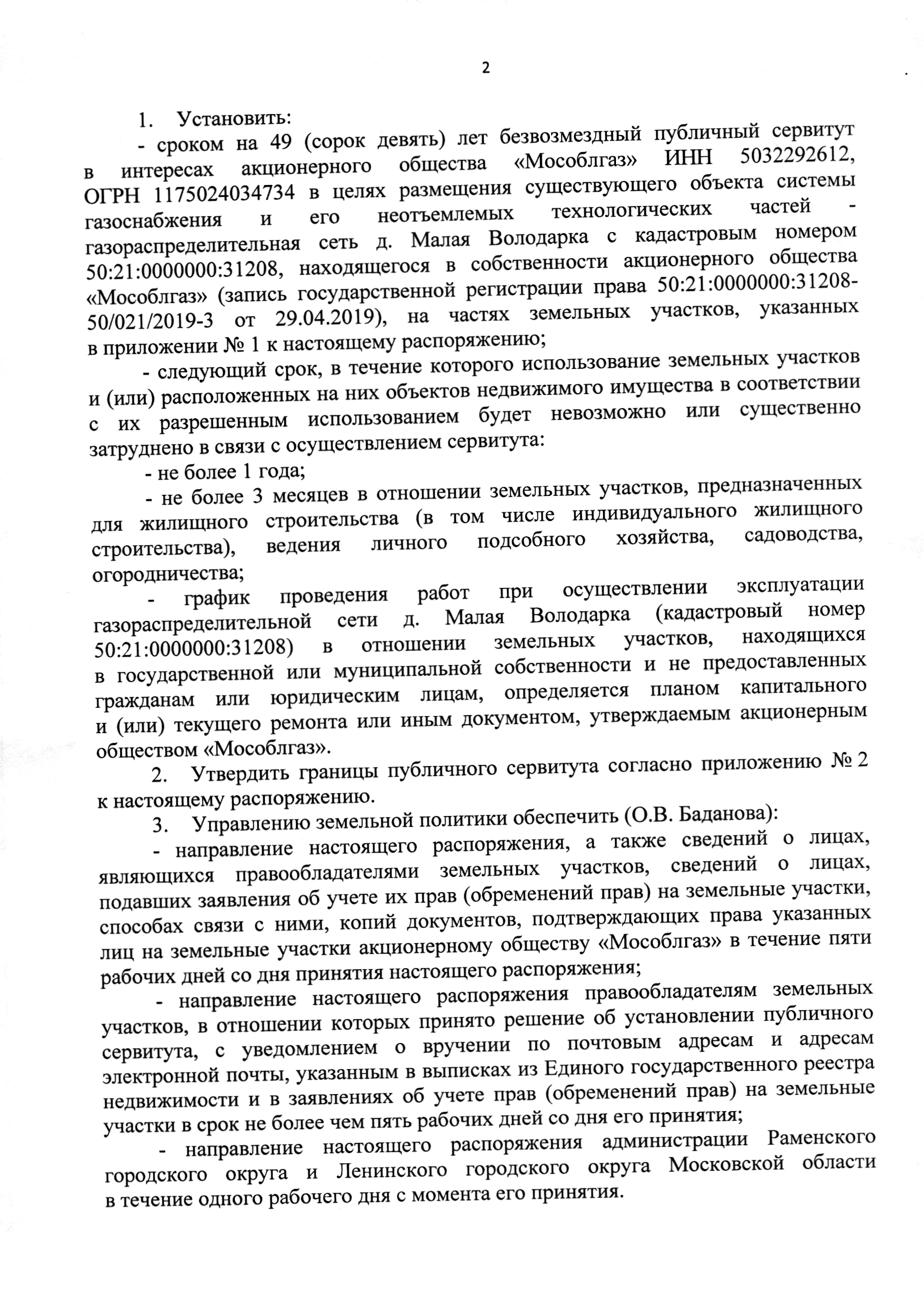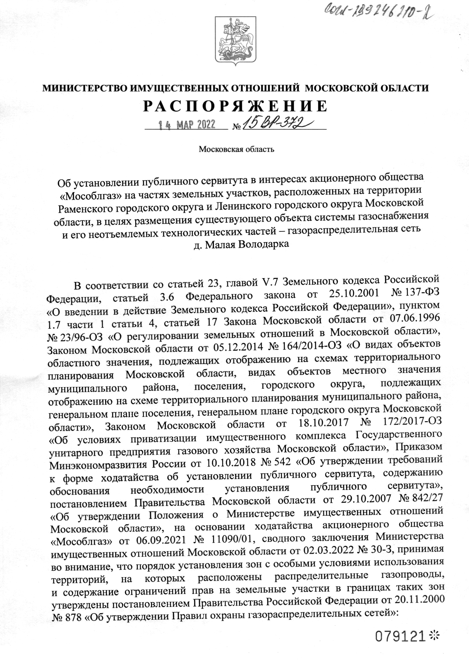 2715. Распоряжение Министерства имущественных отношений Московской области № 15ВР-372 от 14.03.2022 «Об установлении публичного сервитута в интересах акционерного общества «Мособлгаз» на частях земельных участков, расположенных на территории Раменского городского округа и Ленинского городского округа Московской области, в целях размещения существующего объекта системы газоснабжения и его неотъемлемых технологических частей – газораспределительная сеть д. Малая Володарка»
