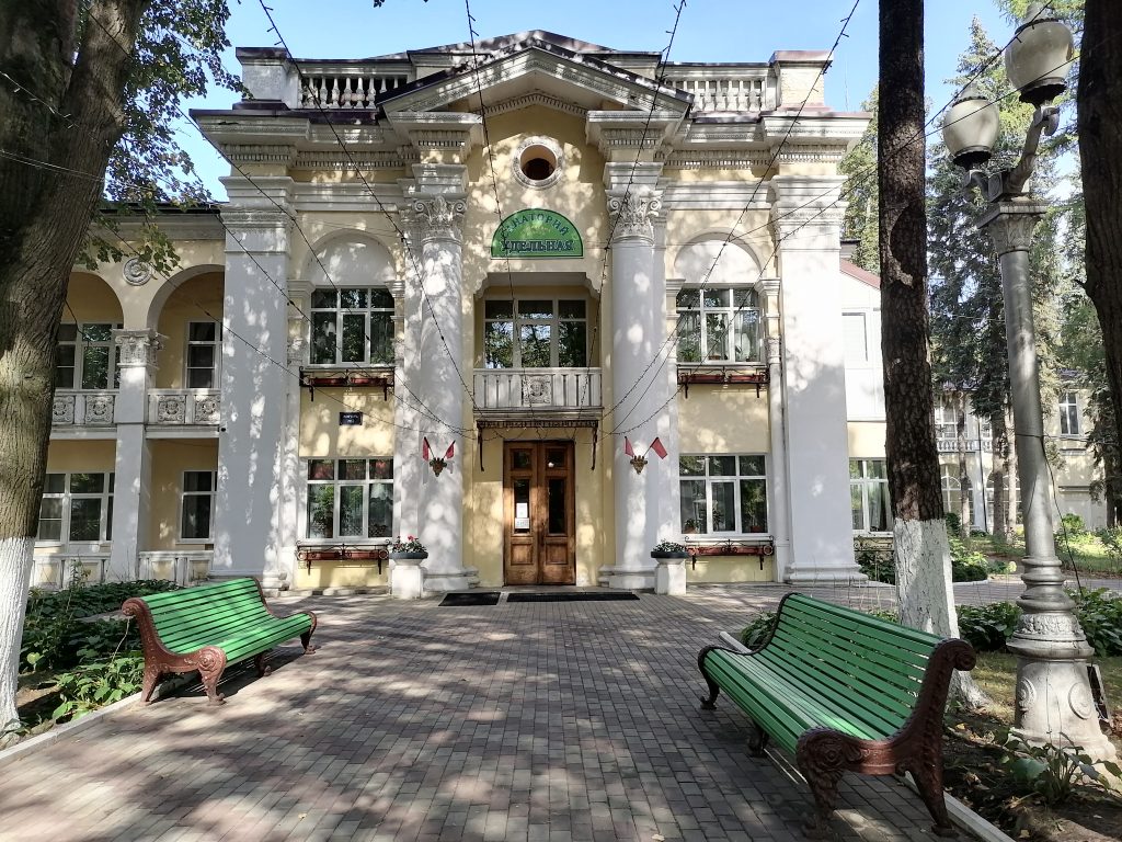 У санатория просторная территория с прудом, по которой можно прогуляться. При желании — арендовать беседку с мангалом и пожарить шашлык. Чтобы постояльцы не скучали, здесь продумана развлекательная программа. Если вы едете с детьми, то их порадует современная игровая площадка.