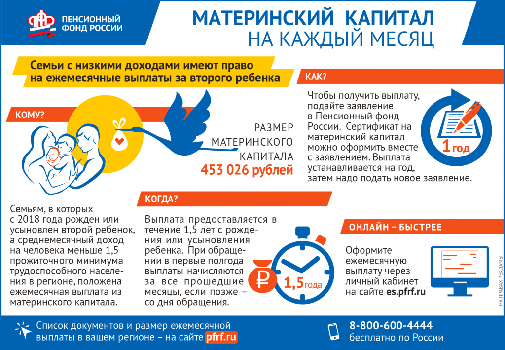 Раменское управление Пенсионного фонда напоминает жителям Раменского района и г.о.Бронницы о том, что ежемесячная выплата из средств материнского капитала семьям, имеющим на нее право (это семьи с низкими доходами), осуществляется до достижения ребенком полутора лет.