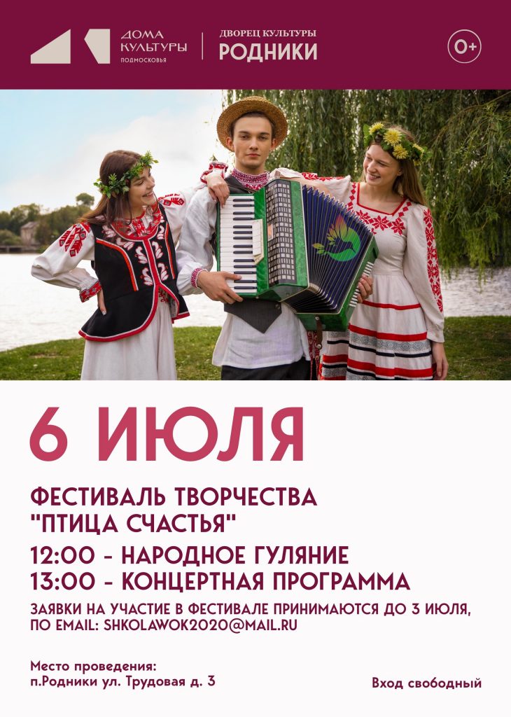 Фестиваль творчества «Птица счастья» открывает свои двери для всех желающих. Участие в фестивале могут принять лица с 15 лет и старше.