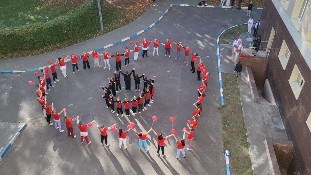 Воспитанники хореографического коллектива «Бастет» из ДК им.Воровского исполнили танец возле центральной поликлиники на ул.Махова в «больничном городке» г.Раменское. Акцию поддержали сотрудники больницы. Они выстроились в виде сердца, держа в руках красные шарики – символы сердца.