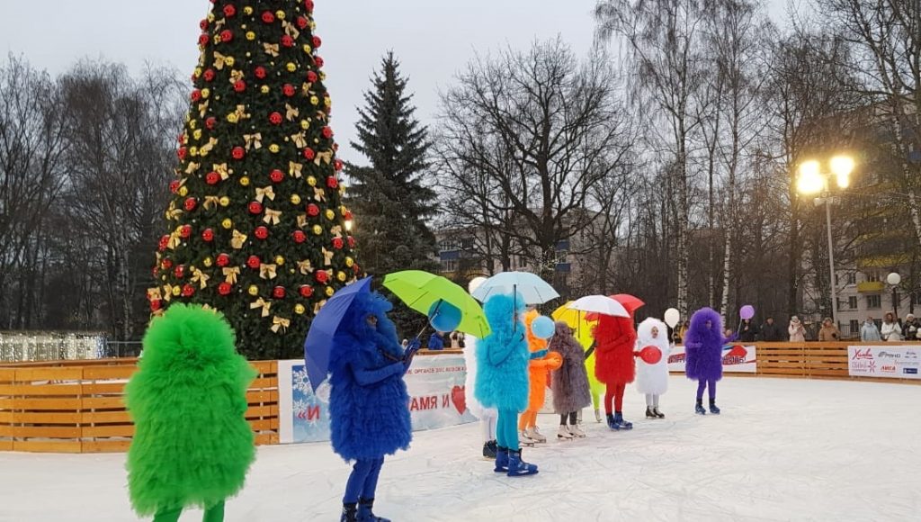 На городском катке в сквере «Юбилейный» в городе Химки под Новогодней ёлкой соединили свои судьбы 12 пар молодоженов из разных муниципальных образований Подмосковья: Клина, Мытищ, Королева, Орехово-Зуева, Лотошино, Красногорска, Солнечногорска, Химок, Волоколамска, Одинцова, Луховиц.