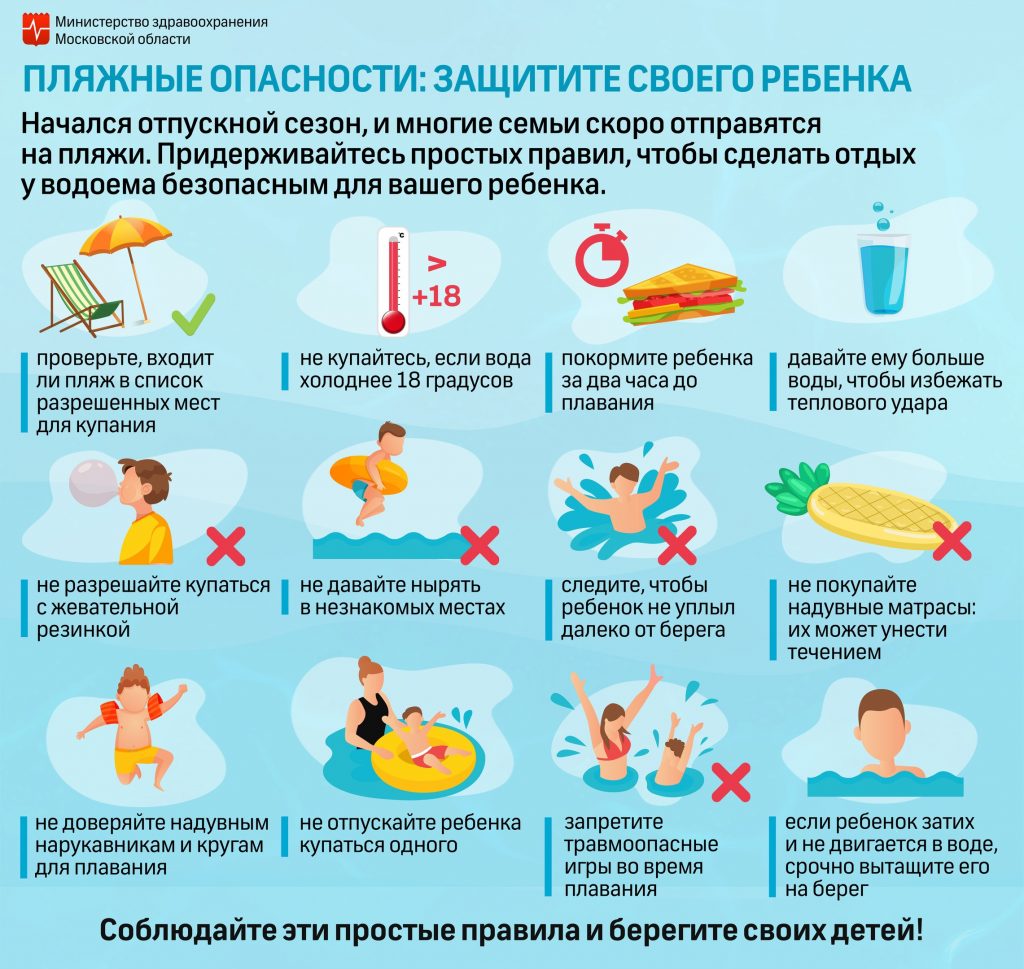 «Не давайте детям обильную пищу до купания, чтобы избежать судорог. Кстати, есть важное предупреждение, которое легко можно не заметить – у ребенка во время купания не должно быть во рту жевательной резинки. На пляже допустим легкий перекус и достаточное питье. Не стоит доверять нарукавникам, кругам для плавания и надувным матрасам: ребенок может выскользнуть, соскочить и испугаться, что приведет к неконтролируемой ситуации. Взрослые постоянно должны контролировать купание детей. Разумеется, при детях, ни о каком алкоголе и речи не должно быть», — добавила специалист.