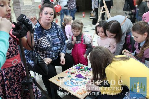 Перед началом мероприятия в фойе для ребят и взрослых была устроена выставка фото и видеотехники прошлого. Кроме этого, маленькие гости и их родители смогли поучаствовать в процессе гримирования, лепке пластилиновых мультгероев, а также под опытным руководством оператора Первого канала подержать на плече и применить по назначению настоящую видеокамеру.