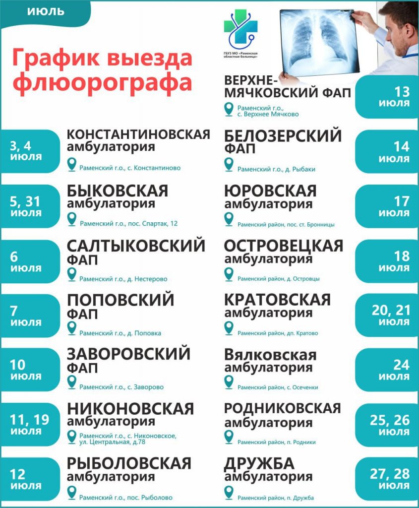 ГРАФИК ВЫЕЗДА МОБИЛЬНОГО ФЛЮОРОГРАФА В АМБУЛАТОРНО-ПОЛИКЛИНИЧЕСКИЕ ПОДРАЗДЕЛЕНИЯ РАМЕНСКОЙ ОБЛАСТНОЙ БОЛЬНИЦЫ