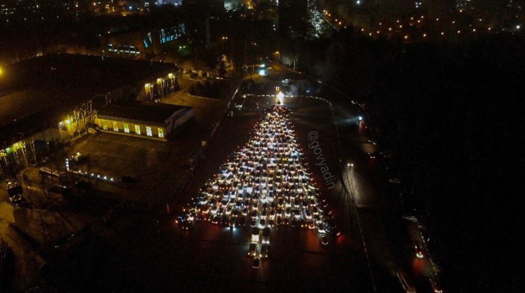 На парковке стадиона «Сатурн» из автомобилей построили Новогоднюю елку