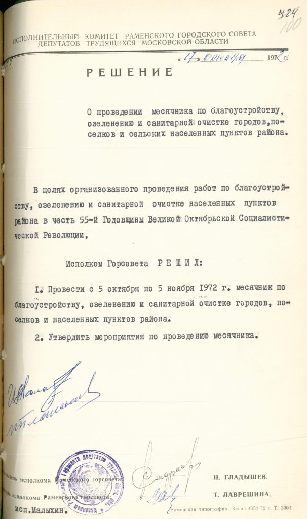 Предлагаем вашему вниманию одно из таких решений, которое было принято 17 октября 1972 года заседанием исполнительного комитета Раменского городского Совета депутатов трудящихся Московской области.
