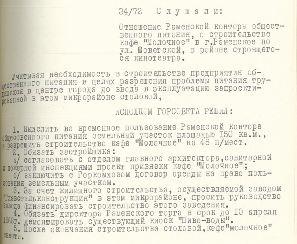 Исполнительный комитет решил, что пока в этом микрорайоне нет столовой, необходимо выделить земельный участок под строительство кафе, финансирование строительства осуществить за счет завода «Главстальконструкция», а также, после строительства столовой для питания трудящихся в центре города, кафе «Молочное» снести.