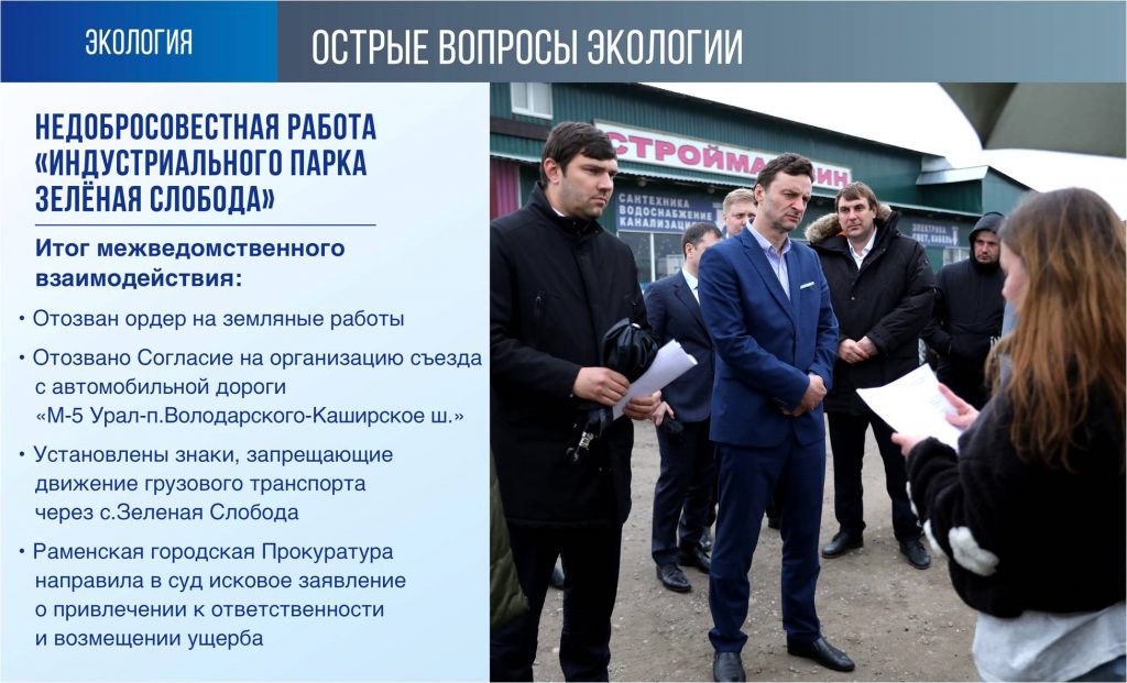 Так, администрацией был отозван ордер на проведение земляных работ в индустриальном парке Зеленая слобода. Благодаря обращениям жителей, в отношении этой компании был выявлен целый ряд нарушений, в том числе незаконное захоронение отходов и добыча известняка.