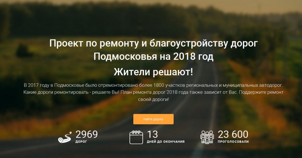С 25 декабря по 1 февраля на портале «Добродел» проходит народное интернет-голосование по включению дорог Московской области в программу ремонта 2018 года. Каждый житель может оставить свой голос за ремонт региональной или муниципальной дороги в программу первоочередного ремонта. Всего в список на голосование вынесено более 2,5 тыс объектов на региональных и муниципальных дорогах области. Большую часть дорог, вынесенных на голосование, определили по итогам сбора предложений, проходившем также на портале «Добродел».