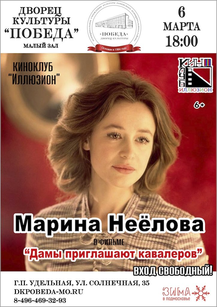 6 марта киноклуб будет посвящен творчеству актрисы Марины Неёловой и просмотру фильма «Дамы приглашают кавалеров».