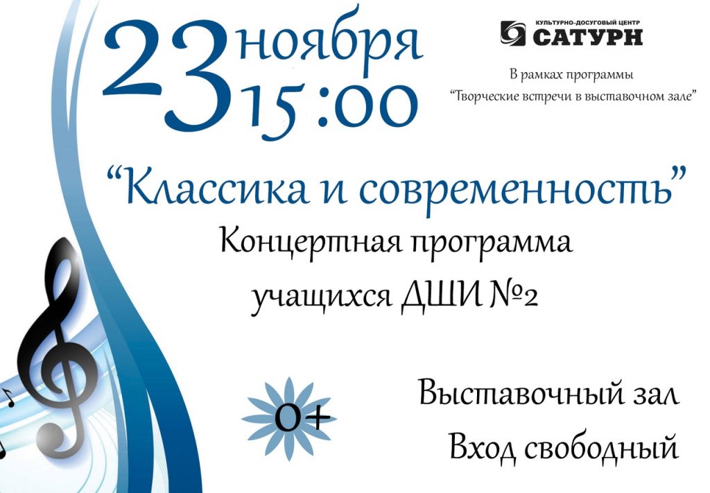 23 ноября в КДЦ «Сатурн» г.Раменское состоится концерт учащихся и преподавателей Раменской ДШИ №2 «Классика и современность». Концерт пройдет в рамках проекта «Творческие встречи в выставочном зале»