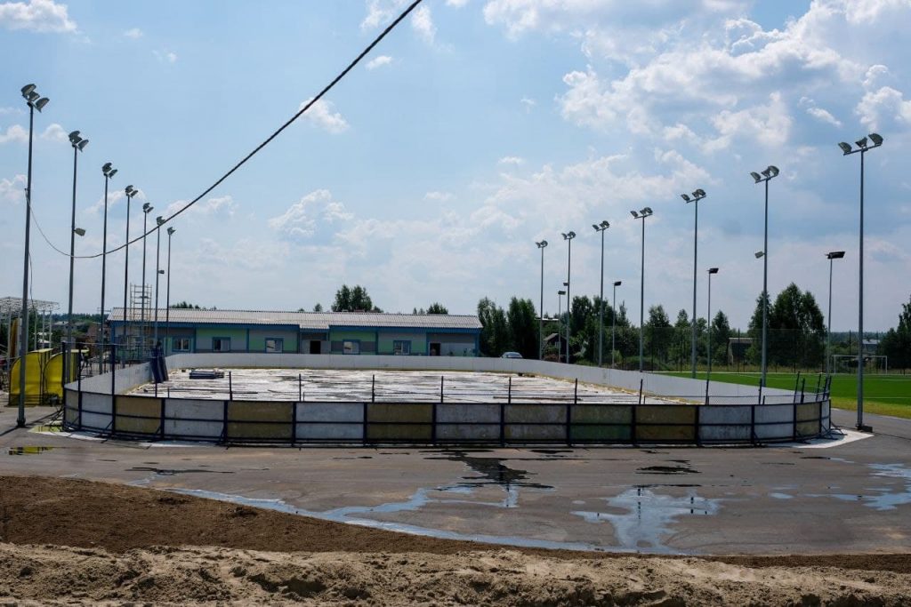 В рамках проекта предусмотрено устройство футбольного поля с искусственным покрытием размером 105х68 метров, которое включает устройство трибуны с навесом, установку мачт освещения и скамеек для запасных игроков, а также устройство хоккейной площадки размером 60х30 метров и пластикового покрытия для занятий роллеркеем.