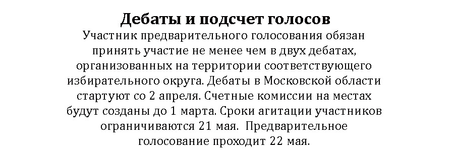 Выдвижение на праймериз началось 15 февраля, а само предварительное голосование пройдет 22 мая. За это время пройдут встречи кандидатов с жителями, а также дебаты. Будет идти профессиональный разговор на различные темы. В регламенте прописано, что каждый кандидат должен пройти не менее двух дебатов. На сайте московского областного отделения партии «Единая Россия» будет выложена вся информация о дебатах и график их проведения.