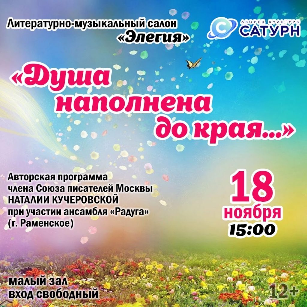 ДК «Сатурн» приглашает любителей литературы на авторскую программу «Душа наполнена до края…» члена Союза писателей Москвы Наталии Кучеровской при участии ансамбля «Радуга» города Раменское.